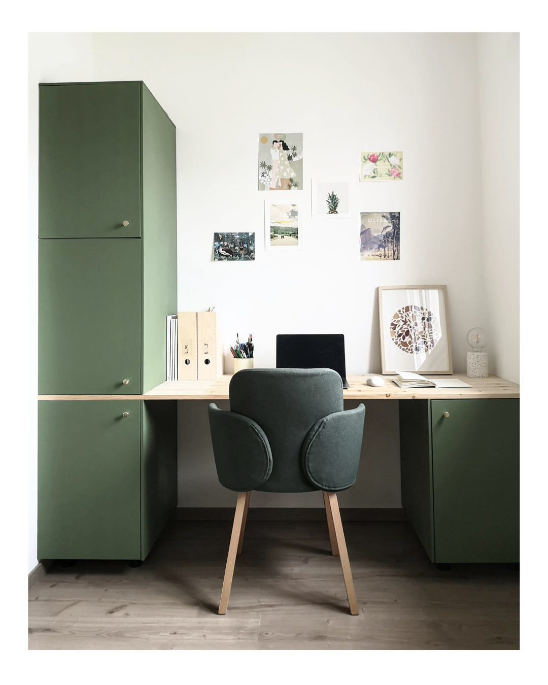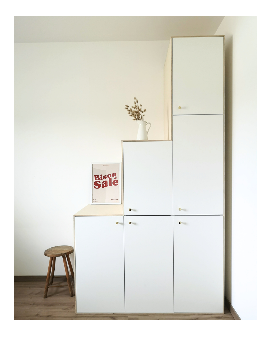Dans la chambre d’amis, l’espace a été optimisé en exploitant un renfoncement de la pièce pour y créer un coin bureau sur mesure. Le meuble en escalier permet de créer des rangements supplémentaires sans alourdir l’espace. Nous avons travaillé sur une base de caissons Ikea, permettant d’optimiser au maximum le coût de cet aménagement.