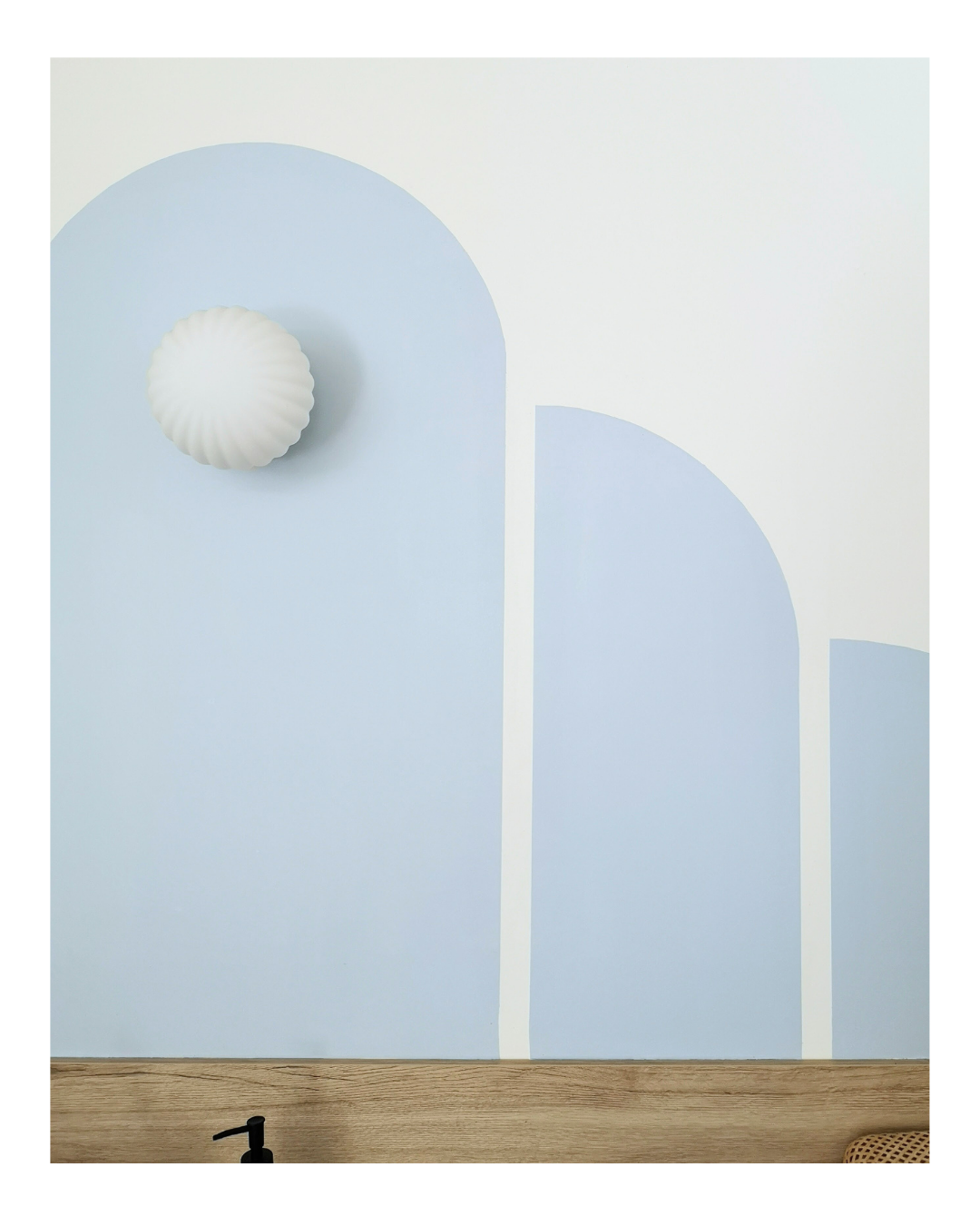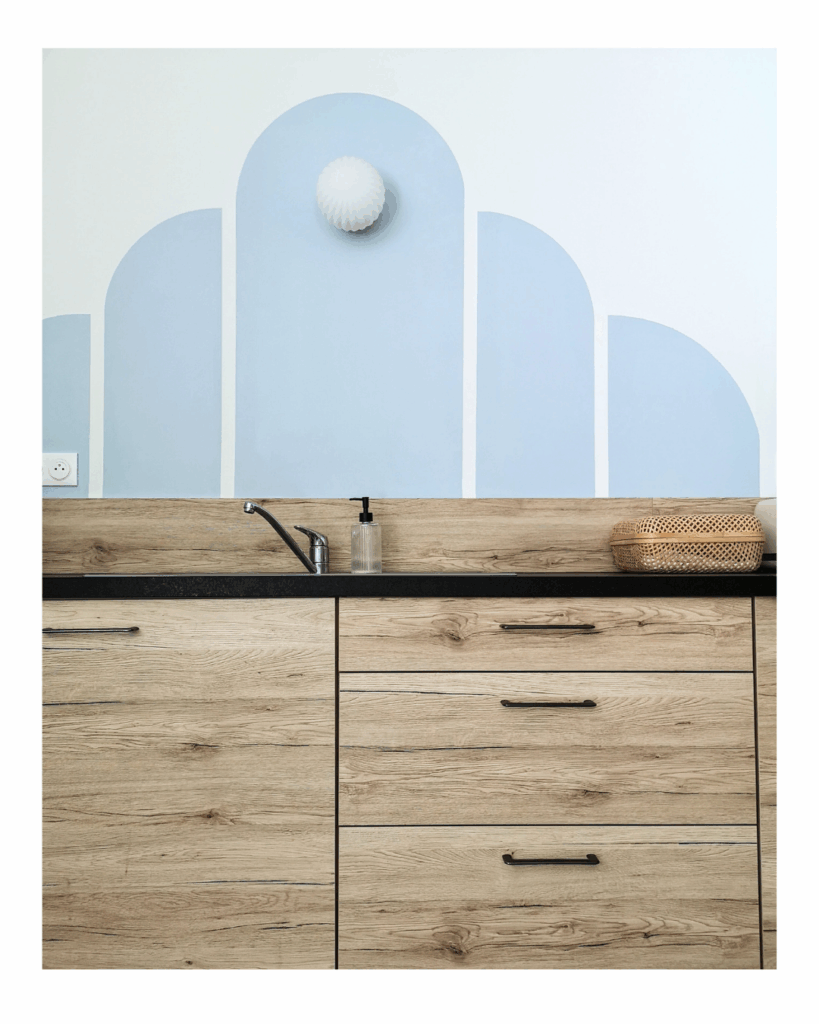 La cuisine, dans un recoin sombre de la maison, a été illuminée d’une peinture bleu ciel dessinée en arche et d’une applique qui éclairera suffisamment le plan de travail.