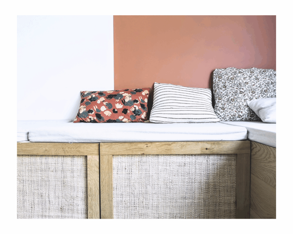 Dans le salon, une banquette sur-mesure a été conçue pour créer un espace convivial, isoler le salon de l’entrée et maximiser les rangements sans encombrer l’espace. Son angle arrondi et ses portes en chêne clair et raphia apportent de la douceur à l’ensemble de la pièce.