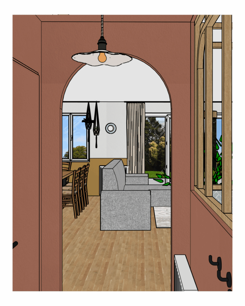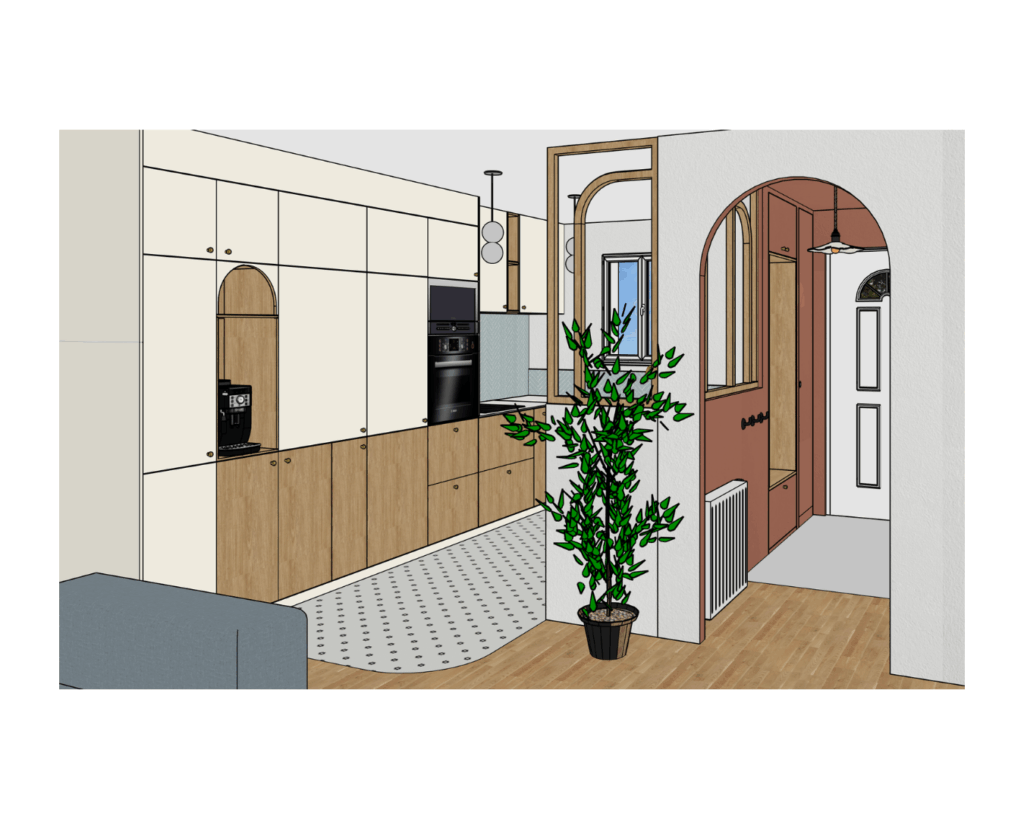 Rénovation complète d’un rez-de-chaussée de maison : cuisine, séjour, entrée.