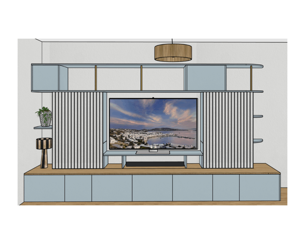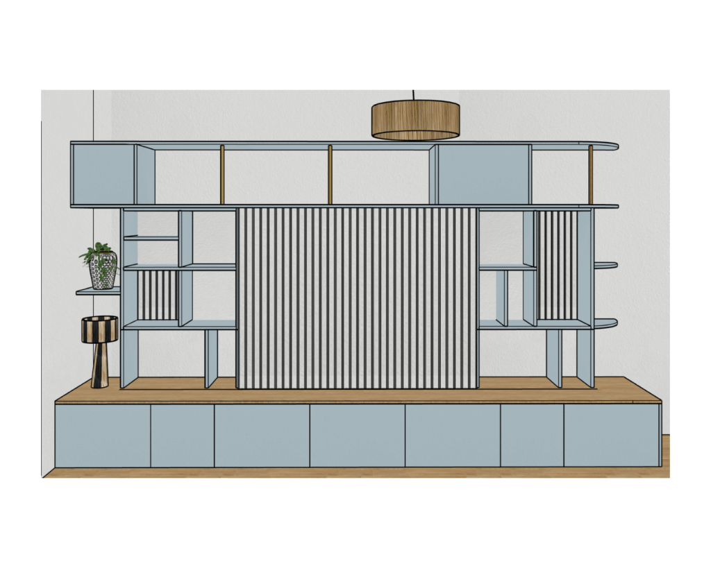 Le salon est habillé d’un grand meuble TV-bibliothèque dessiné sur mesure pour dissimuler la TV et apporter de la convivialité.