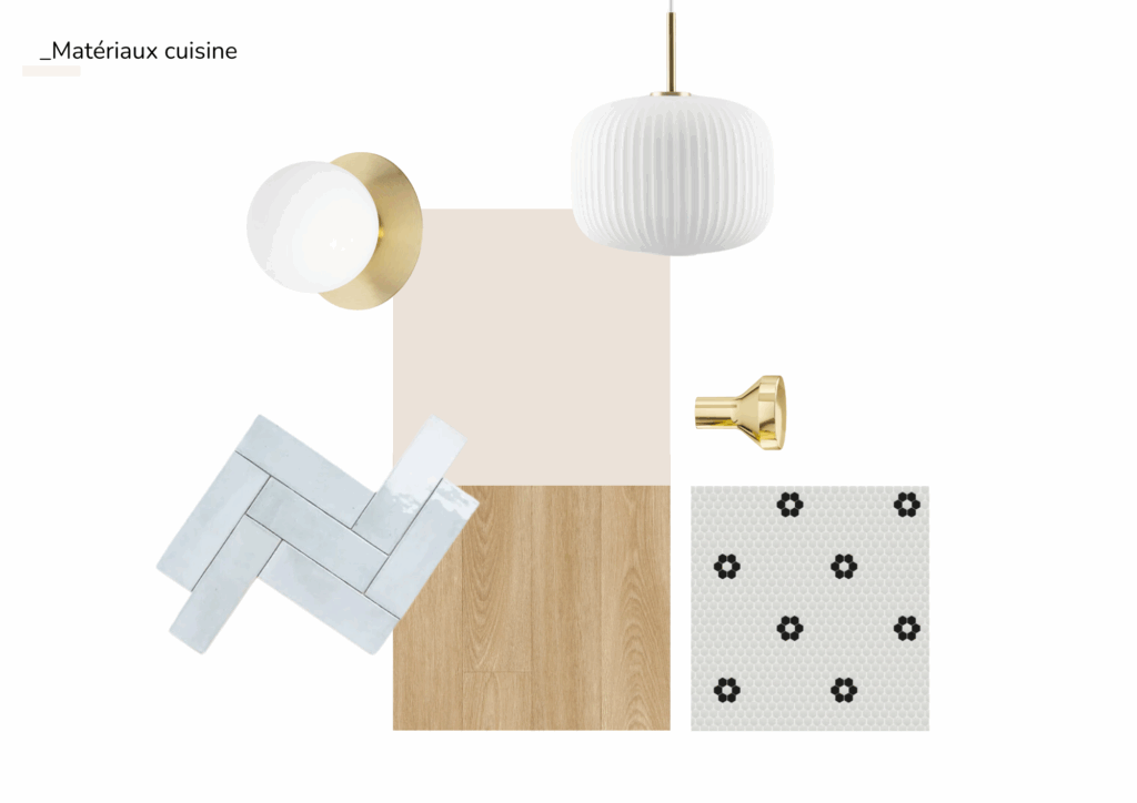 Le sol réalisé en mosaïque structure et souligne le mobilier bois et sable de la cuisine et vient épouser le parquet du salon en douceur avec un angle arrondi.