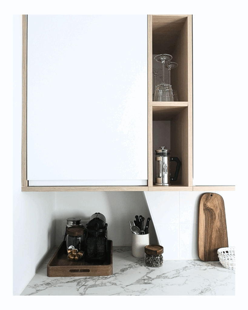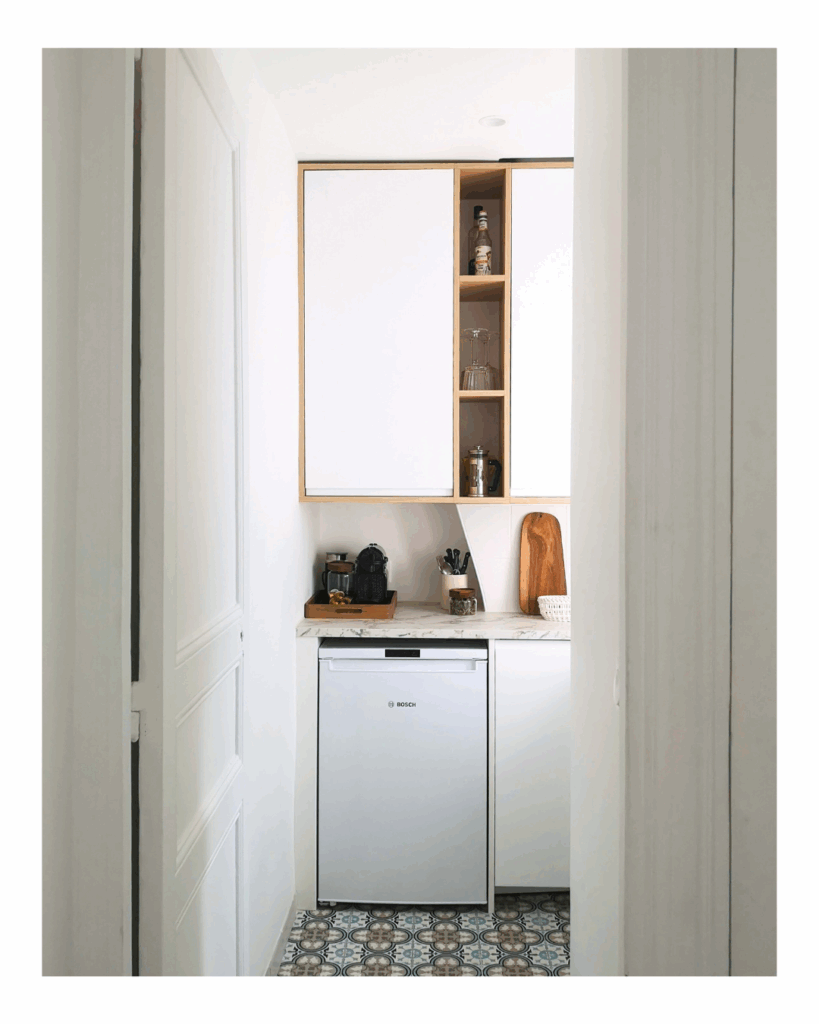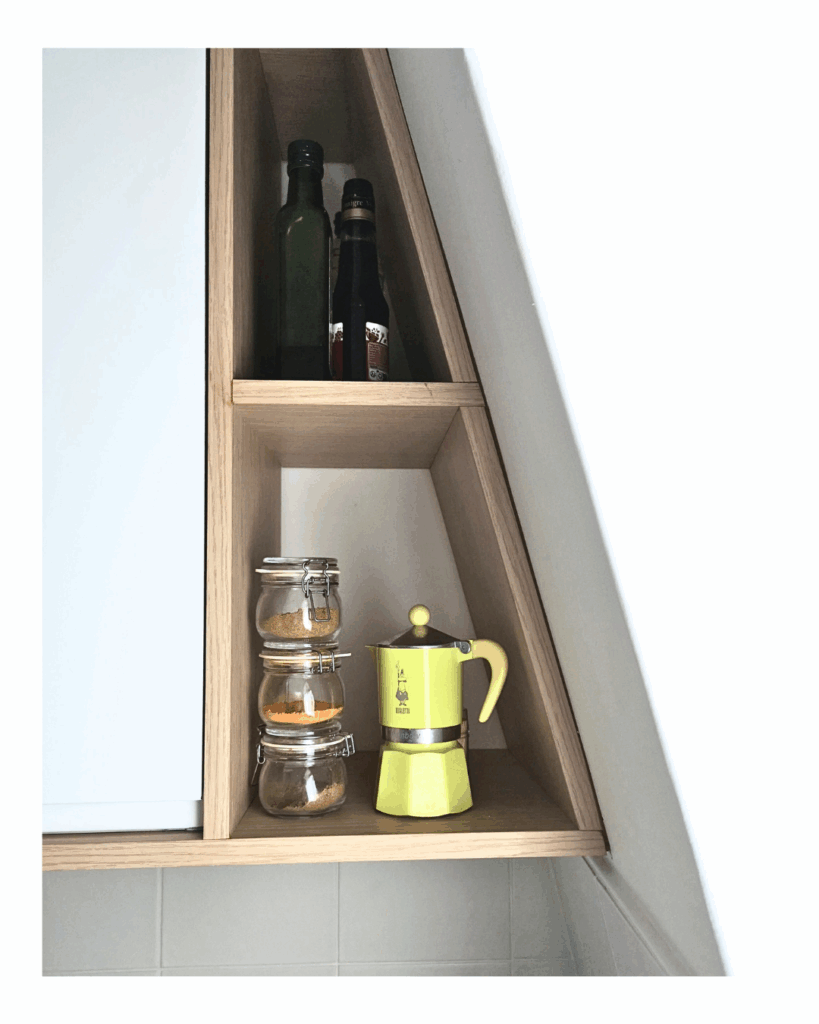 Le défi pour cette cuisine parisienne sous pente de 3m2 était de maximiser les rangements dans un espace où aucun mur, ni aucun angle n’est droit. Le but était de concevoir une cuisine fonctionnelle, facile à vivre mais sans surcharger l’espace. Nous avons donc travaillé en hauteur pour exploiter l’ensemble de l’espace, et ajuster les meubles sur-mesure pour ne perdre aucun angle ni recoin.